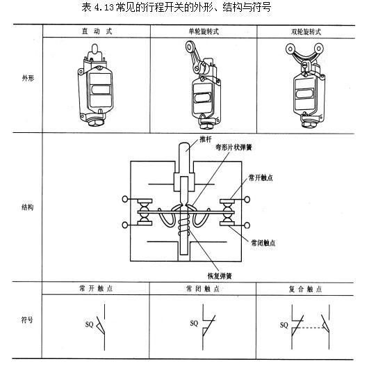 行程開關(guān)主要由操作機構(gòu)、觸點系統(tǒng)和外殼3部分構(gòu)成。行程開關(guān)種類很多,一般按其機構(gòu)可分為直動式、轉(zhuǎn)動式和微動式。常見的行程開關(guān)的外形、結(jié)構(gòu)與符號,如表4.13所示。