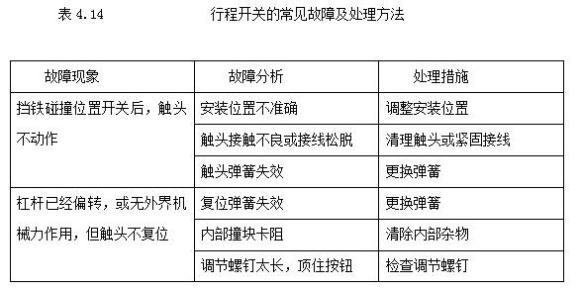 行程開關(guān)的常見故障及處理方法,如表4.14所示。